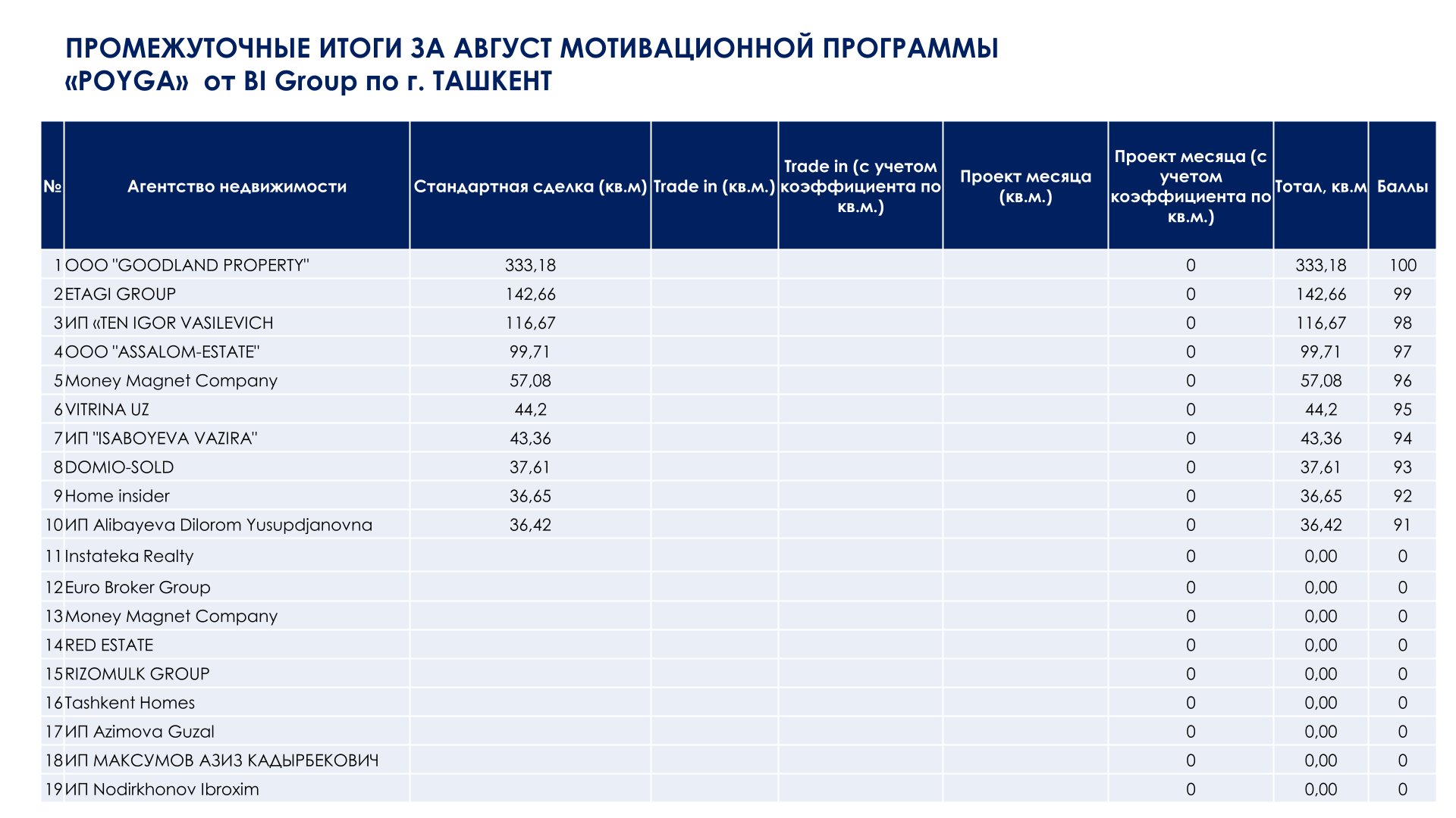 Агентство, продавшее больше всех — получает 100 баллов, второе — 99 и т.д.