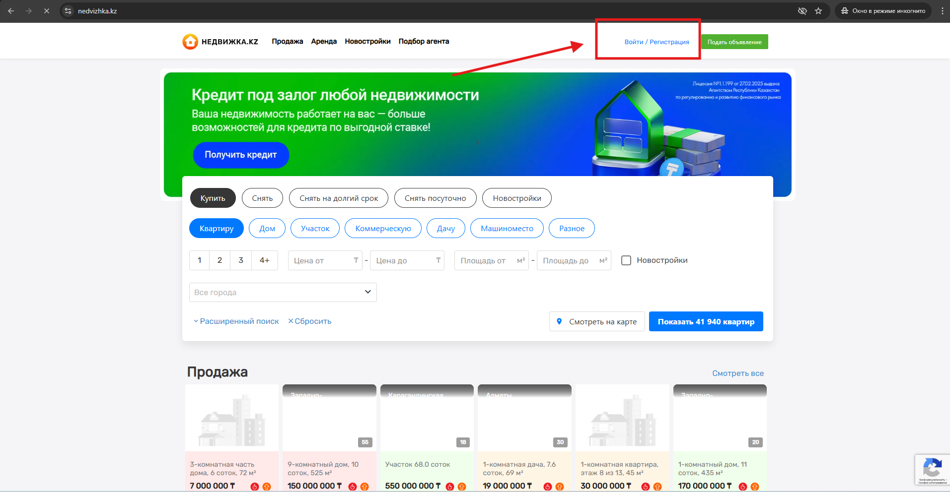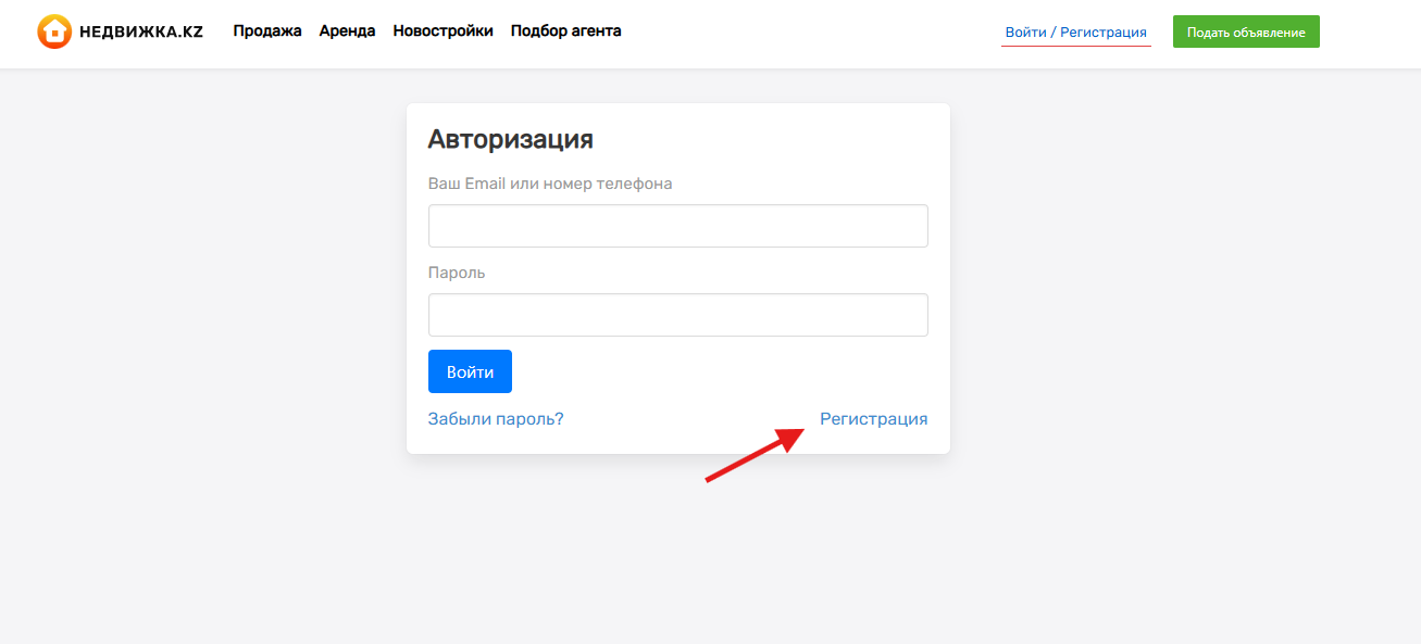 1.1 Перейдите по ссылке https://nedvizhka.kz/ и откройте раздел «Войти / Регистрация».