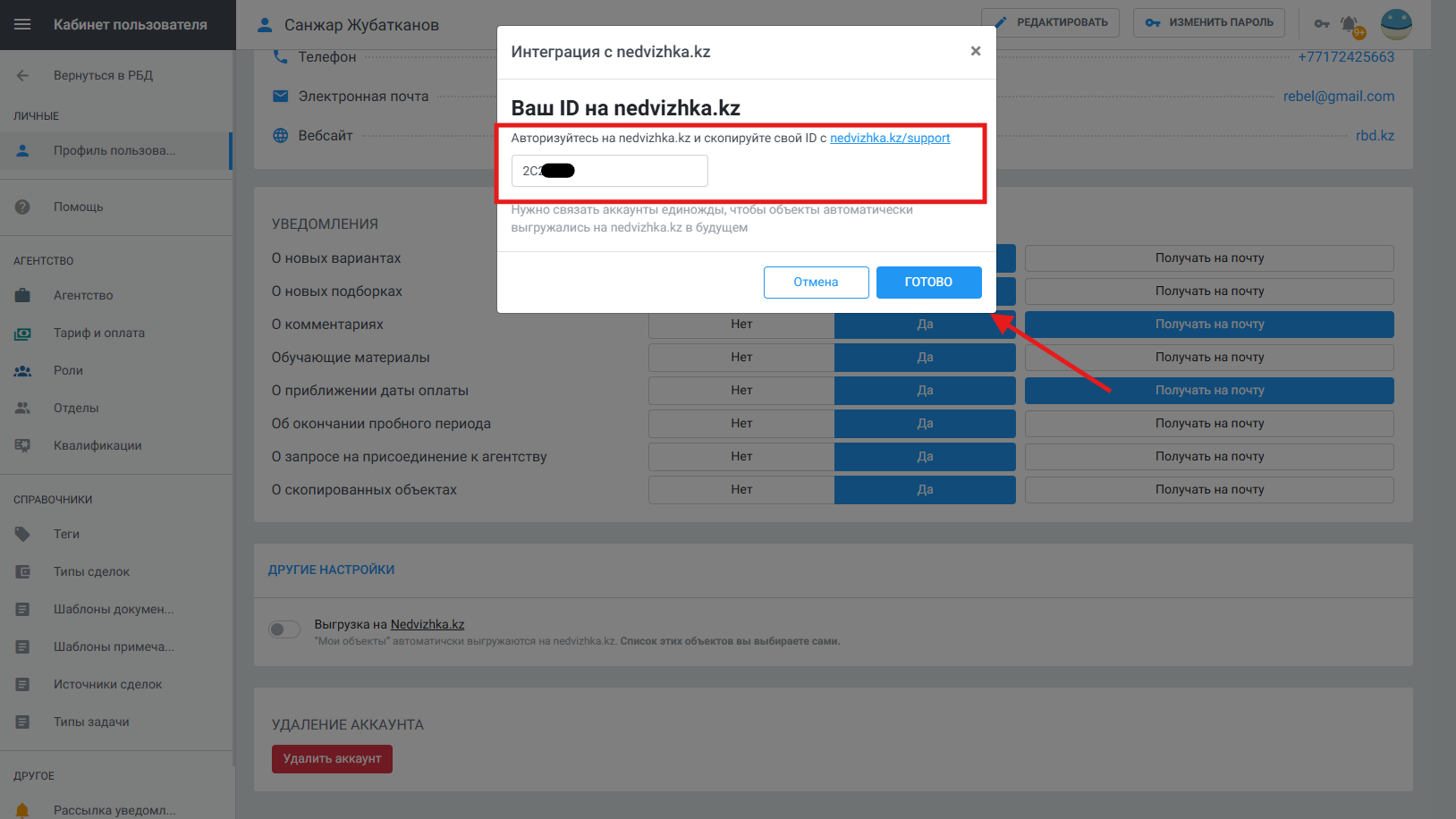 В личном кабинете активировать опцию «Выгрузка объектов на Nedvizhka.kz» и в соответствующем поле заполнить ранее скопированный ID профиля.
