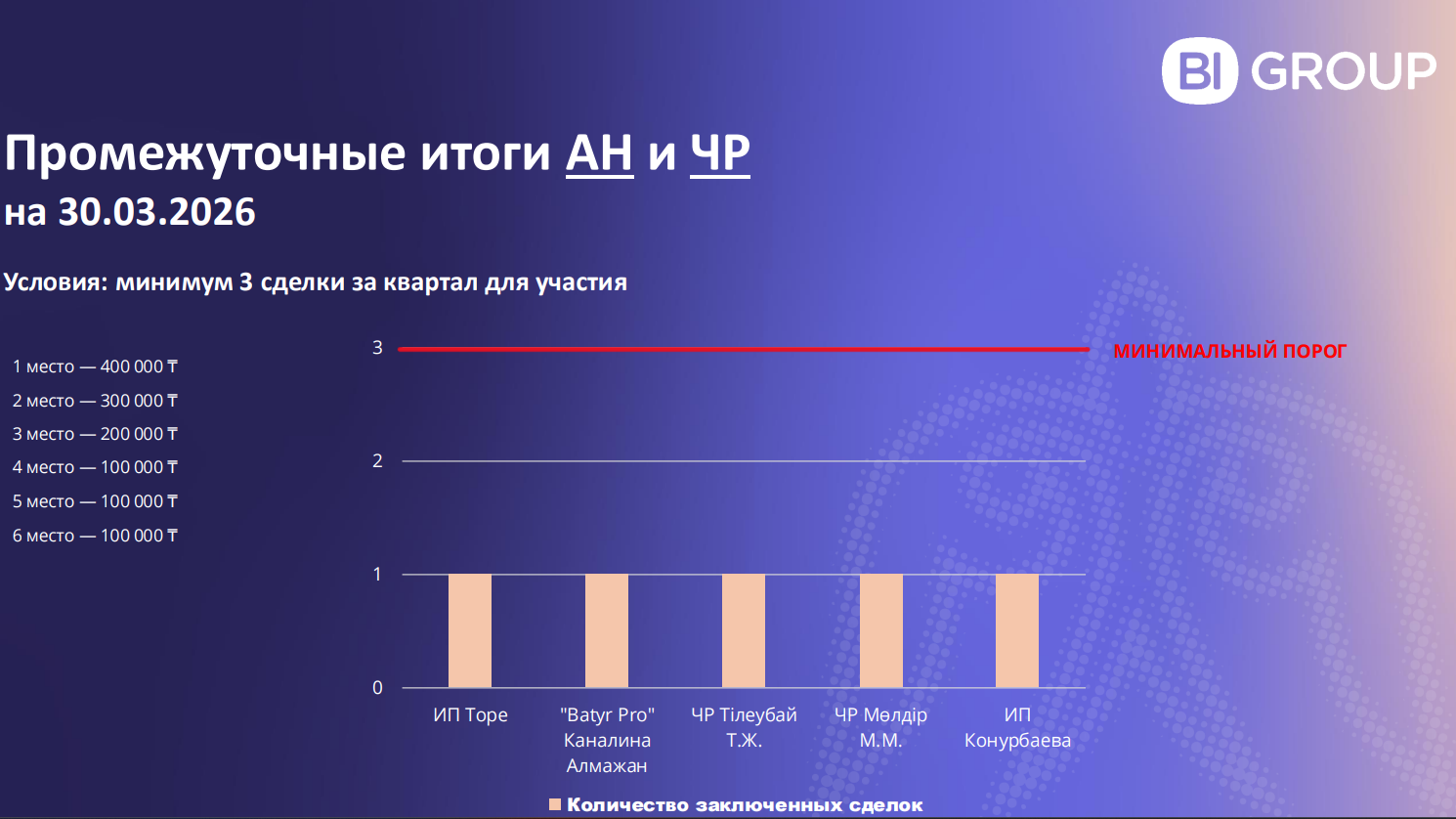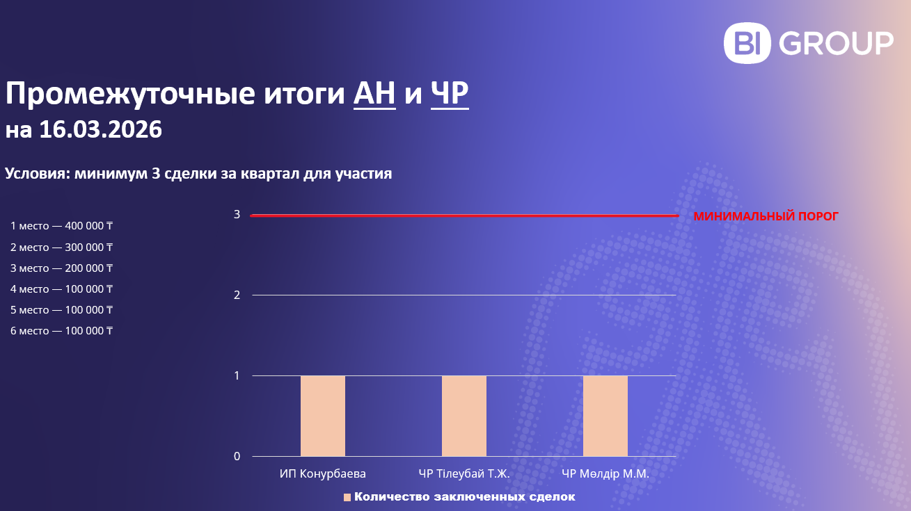 ИП Конурбаева, ЧР Мөлдір М.М. и ЧР Тілеубай Т.Ж. уже в игре — у каждого по 1 сделке из 3 необходимых для участия. 🔥